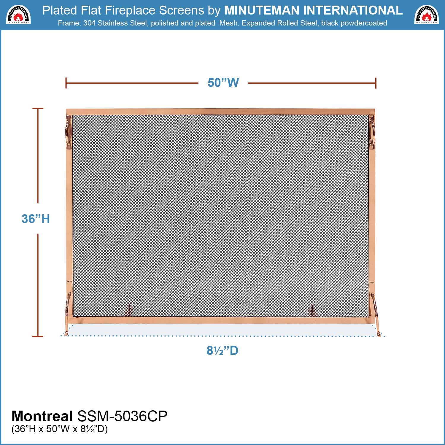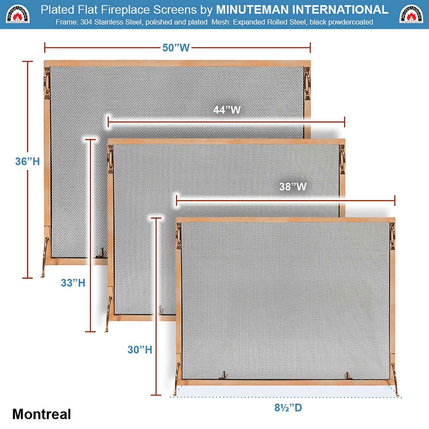 - QUALITY MATERIALS- Montreal Screen frames are made from 304 Stainless Steel with Polished Brass, Nickel and Copper plated finishes. The expanded rolled steel mesh has a black powder coating that is superior to paint. Screens are shipped flat with easily attached handles and feet packed separately.