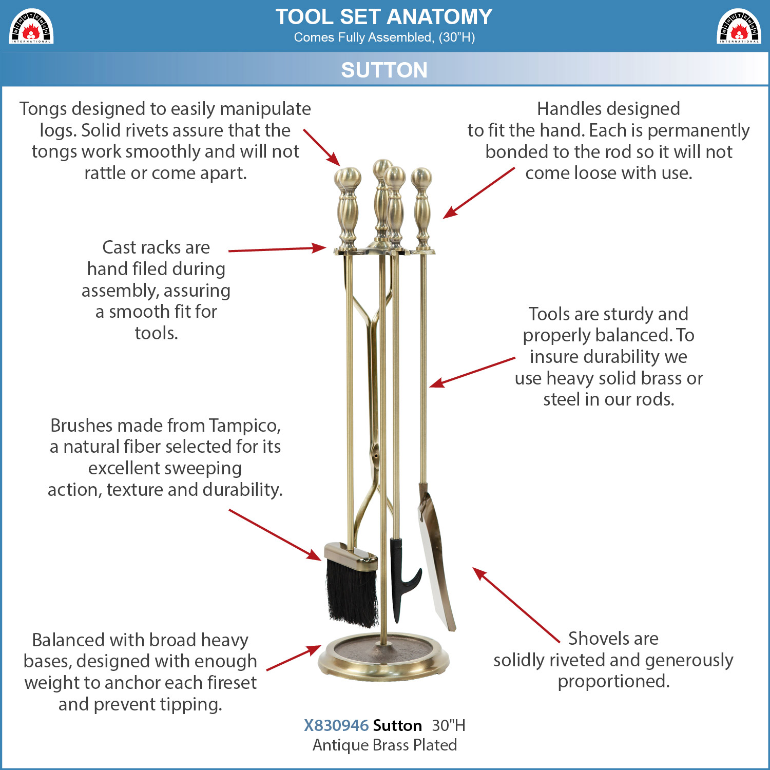 The Sutton Tool Set has a classic ball-end handle design, and simple circular base. The variety of handle finish options can coordinate with many of our Minuteman International Fireplace Screens. Handles and bases are solid, zinc die-cast with solid rod handles for comfortable weight and good balance. The radial stand has a central handle for moving the tool set and four notches to hold poker, tongs, shovel and natural fiber brush.