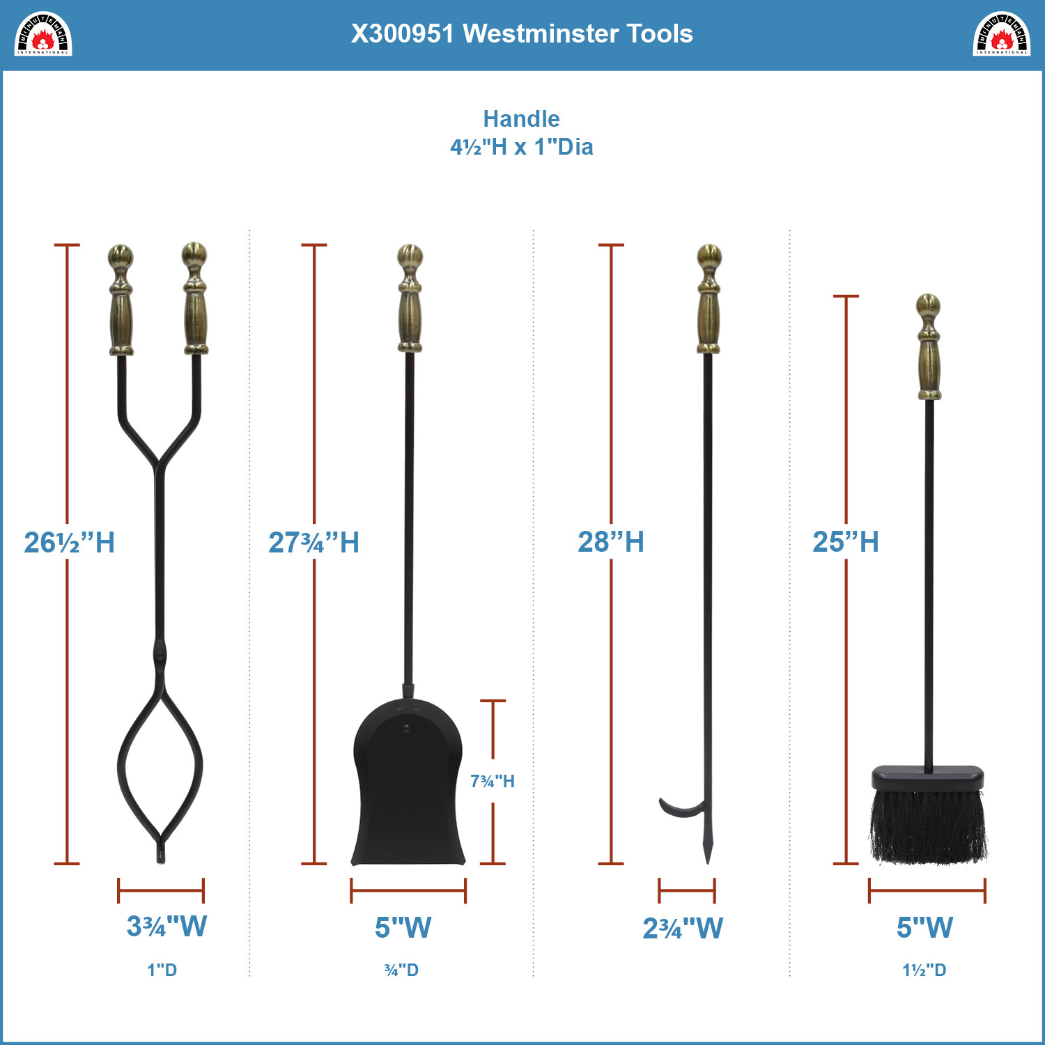 The Westminster Tool Set has a classic ball-end handle design, rectangular base, and holds four tools – poker, tongs, shovel and natural Tampico fiber brush. Our tool handles and bases are solid, zinc die-cast with solid rods for comfortable weight and good balance. In Polished Brass, Antique Brass or Antique Brass with Black finish. Pair any of these with one of our Minuteman International Emblem Fireplace Screens with brass accents, or Black wrought iron Fireplace Screens to complete your fireplace decor. Add a wool hearth rug and you are ready to spend a cozy evening at the fireside.