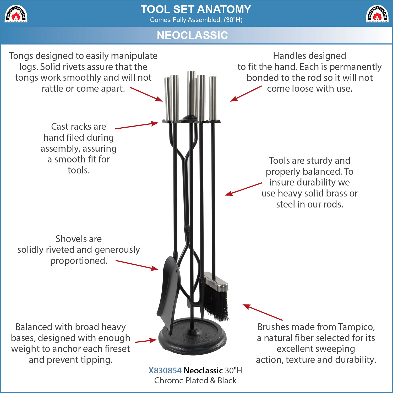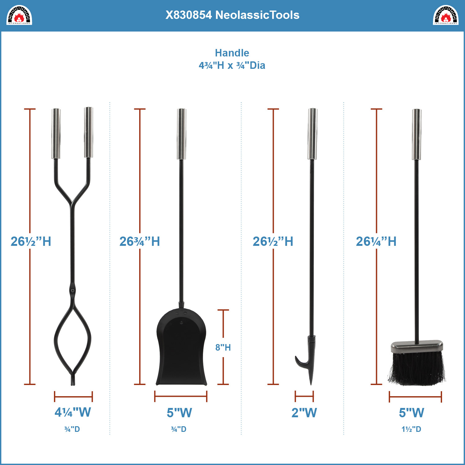 - Set includes Shovel, Tongs, steel-tipped Poker Tampico fiber Brush, and Stand