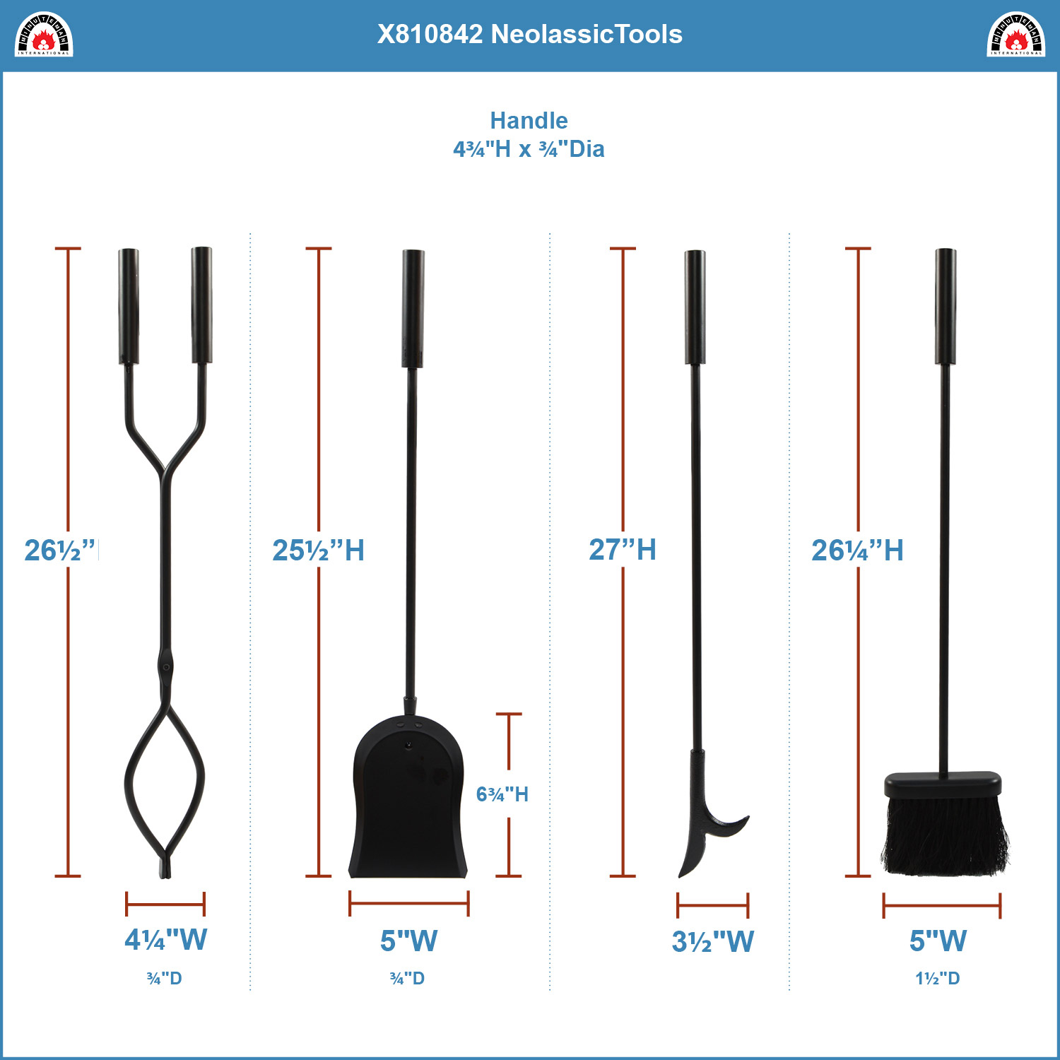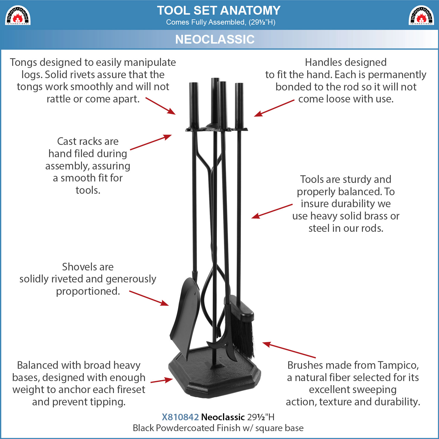 The Neoclassic Tool Sets have a simple, straight, comfortable handle style, that can fit into both a modern or traditional decor. The variety of handle finish options can coordinate with any of our Minuteman International Fireplace Screens. Handles and bases are solid, zinc die-cast with solid rod handles for comfortable weight and good balance. The radial stand has a central handle for moving the tool set and four notches to hold poker, tongs, shovel and natural fiber brush. The all-black version has two base options.