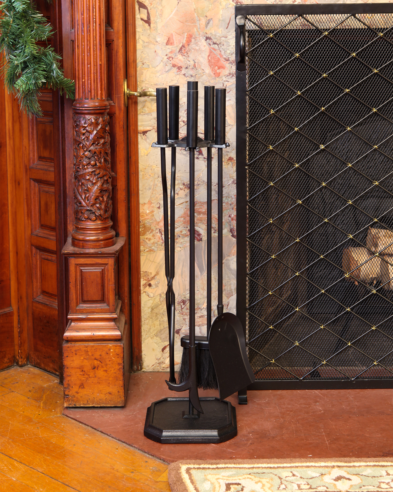 - Set includes Shovel, Tongs, steel-tipped Poker Tampico fiber Brush, and Stand