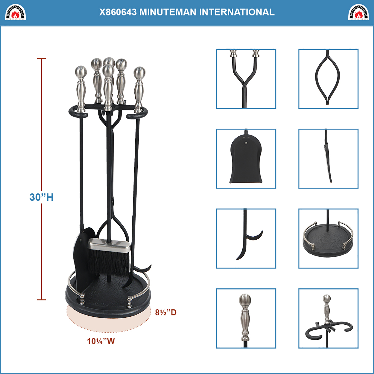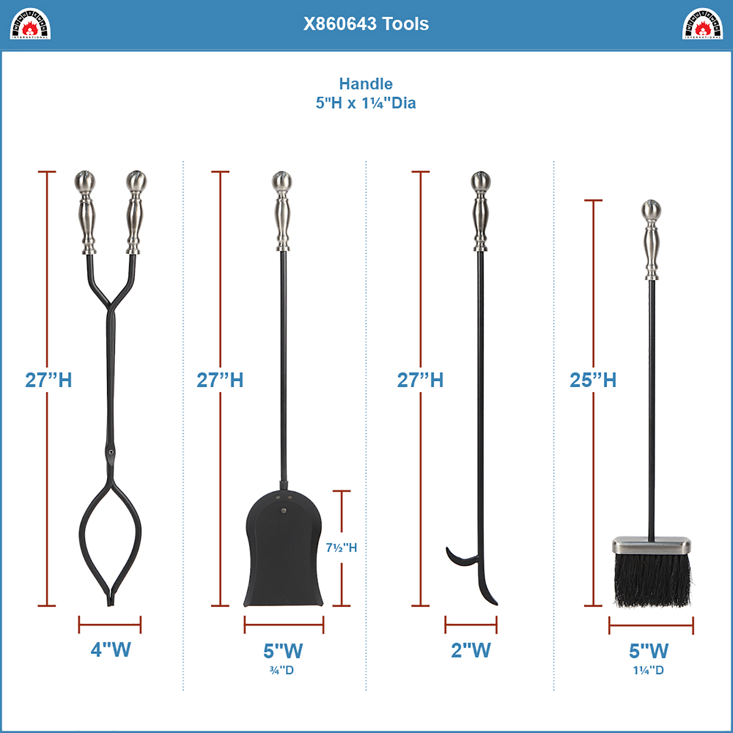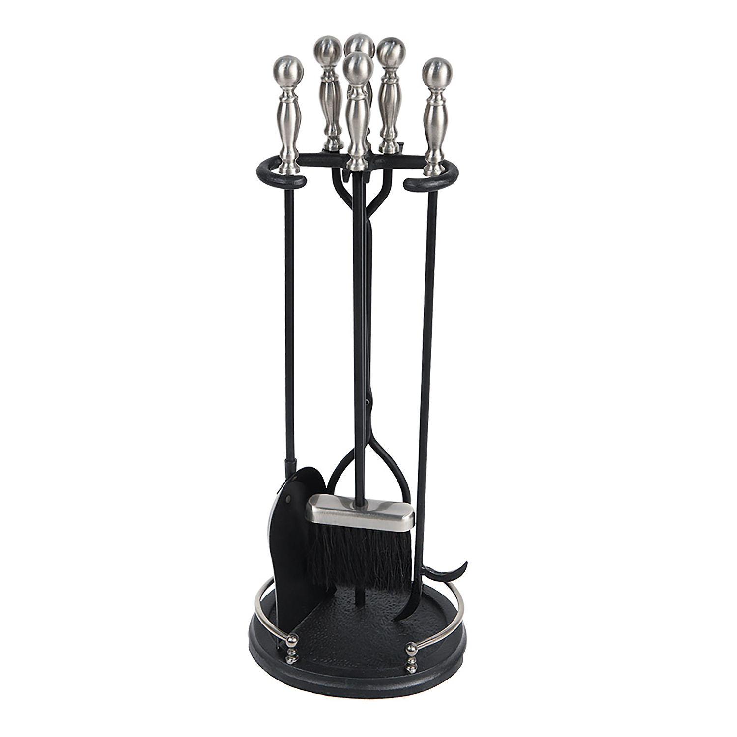 - Set includes Shovel, Tongs, steel-tipped Poker Tampico fiber Brush, and Stand with gallery rail