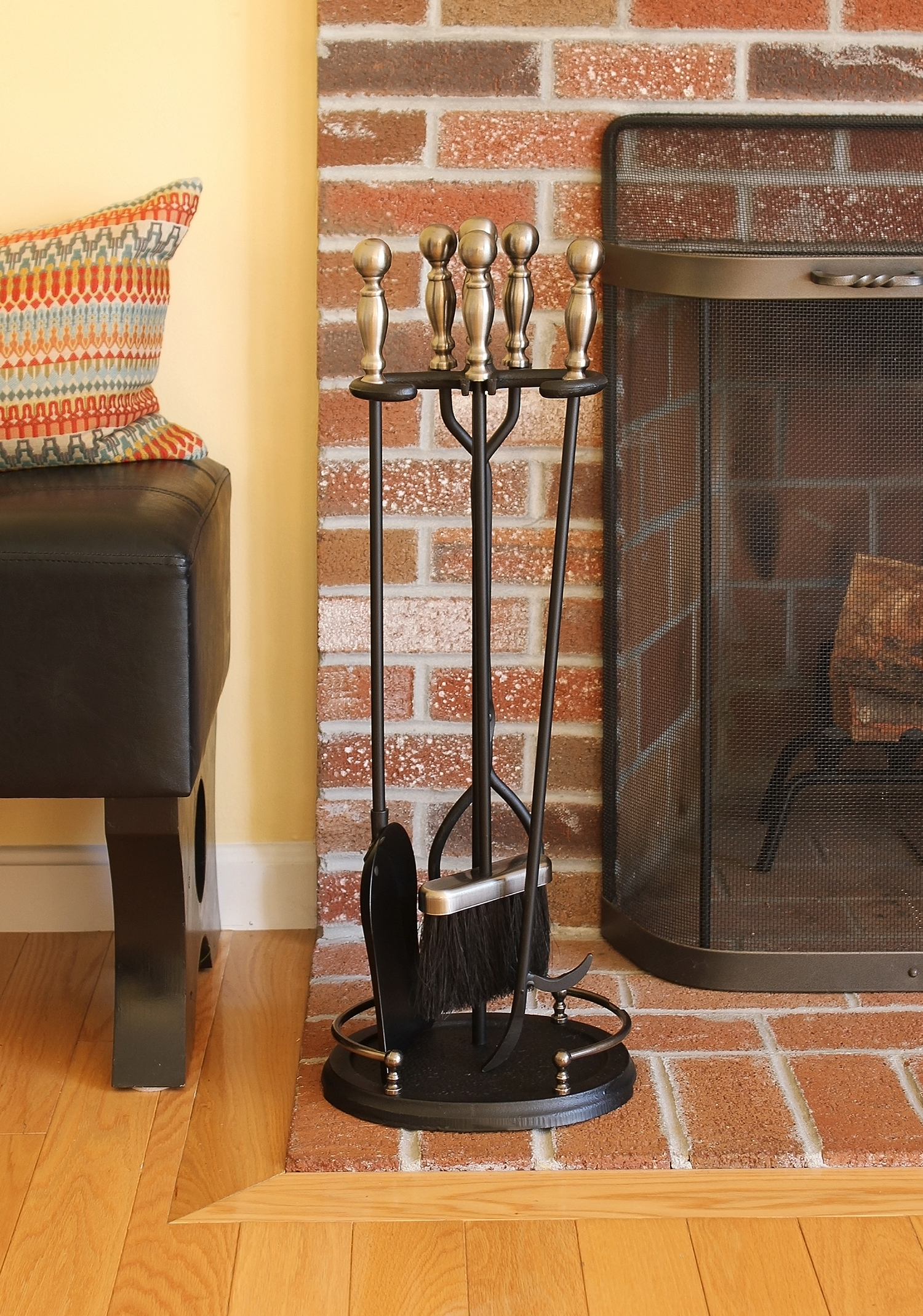 The Boston Tool Set has a classic ball-end handle design, oval base with gallery rail and holds four tools – poker, tongs, shovel and natural Tampico fiber brush. Our tool handles and bases are solid, zinc die-cast with solid rods for comfortable weight and good balance. In Polished Pewter accents with Black powder coated finish. Pair with one of our Minuteman International Fireplace Screens in Black or the plated Montreal Fireplace Screen or to complete your fireplace decor. Add a wool hearth rug and prepare to spend a cozy evening at the fireside.