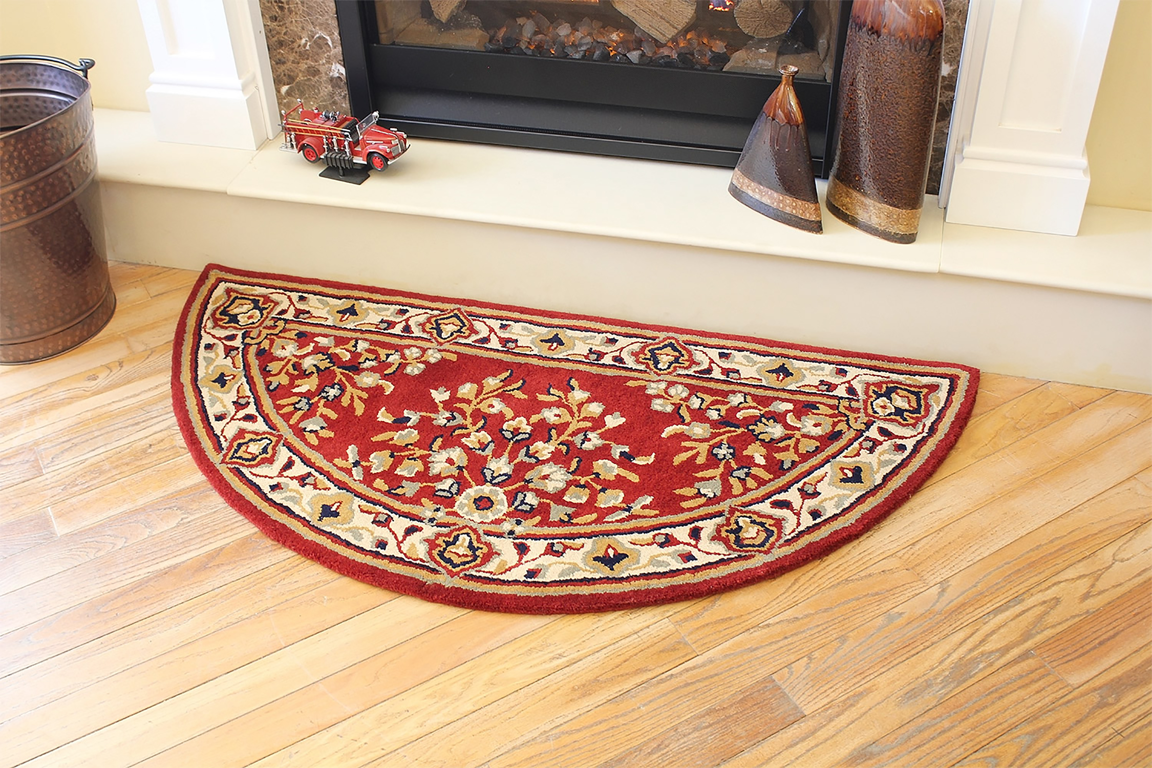 These hearth rugs are inspired by traditional Persian designs. They have five borders and floral medallions in the center. We offer them in rectangles and half rounds, in blue, beige and burgundy. Hearth rugs protect your floor and will add beauty and warmth to your fireplace. They can also be used as door mats or as occasional rugs throughout your house. (For indoor use only). All our hearth rugs are woven from the highest quality 100-percent virgin wool and dyed in rich saturated colors. They are fire resistant and meet federal requirements for surface flammability of small carpets (Part 1631 – FF2-70). Warning: your pets will probably make a bee-line for these rugs so they can bask in the warmth of the fire!