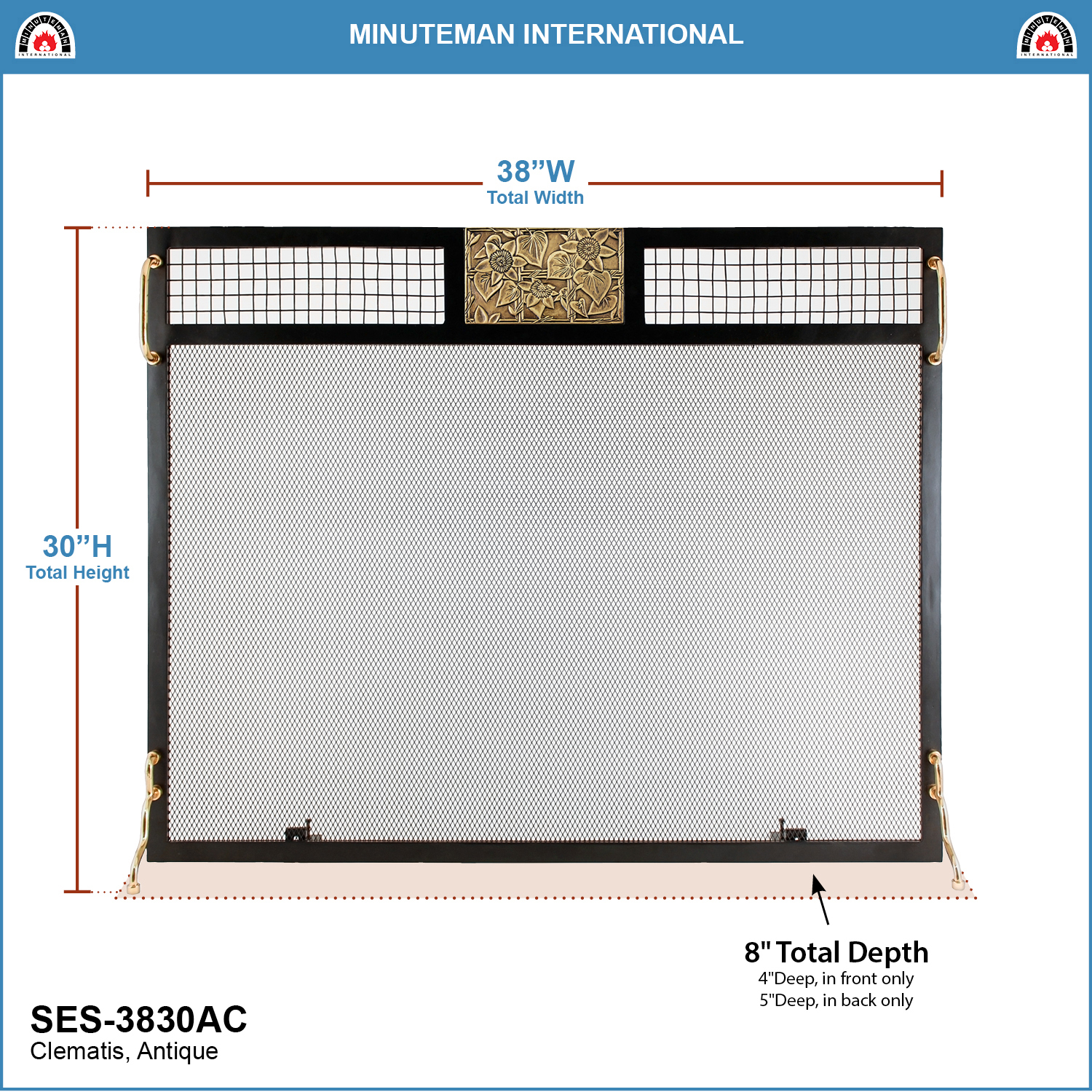 A beautifully rendered floral Clematis and Windowpane Emblem in cast brass is the decorative accent on this flat free-standing fireplace screen. Brass handles and feet stand in bold contrast with the matte black wrought iron frame and mesh. Three finely detailed emblem designs, Clematis, Pineapple and Forest Fox, cast in solid brass, are offered in a choice of Polished or Antique finish. Flat fireplace screens fit close to the fireplace surround, providing safety from flying sparks while minimizing bulk. An attractive accent piece for a Mission or Craftsman style decor, these screens are perfect for a shallower hearth. Complement the Emblem screen with our any of our Minuteman International Fireplace Tool Sets in Black and Brass.