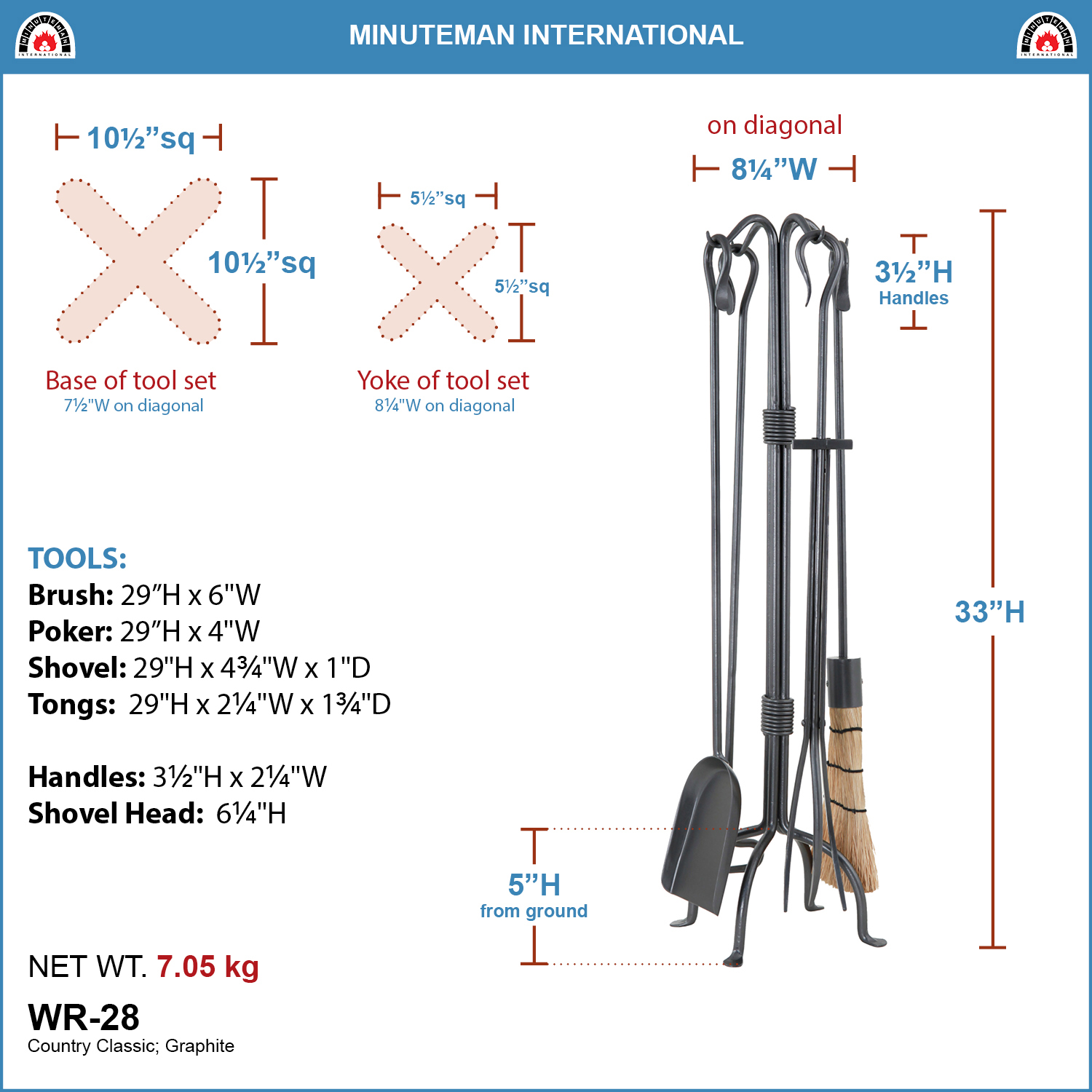 The Country Classic Tool Set is one of our traditional wrought iron sets made with the multi-strand forging technique. Simple and functional, the four tools- poker, tongs, shovel and brush, have looped handles which rest on the four tapering hooks, keeping tools at the ready. Finished in a natural-colored Graphite powder coating, this style pairs well with any of our simple or decorative Minuteman International wrought iron Fireplace Screens. Add a hearth rug to enjoy many cozy evenings at the fireside.