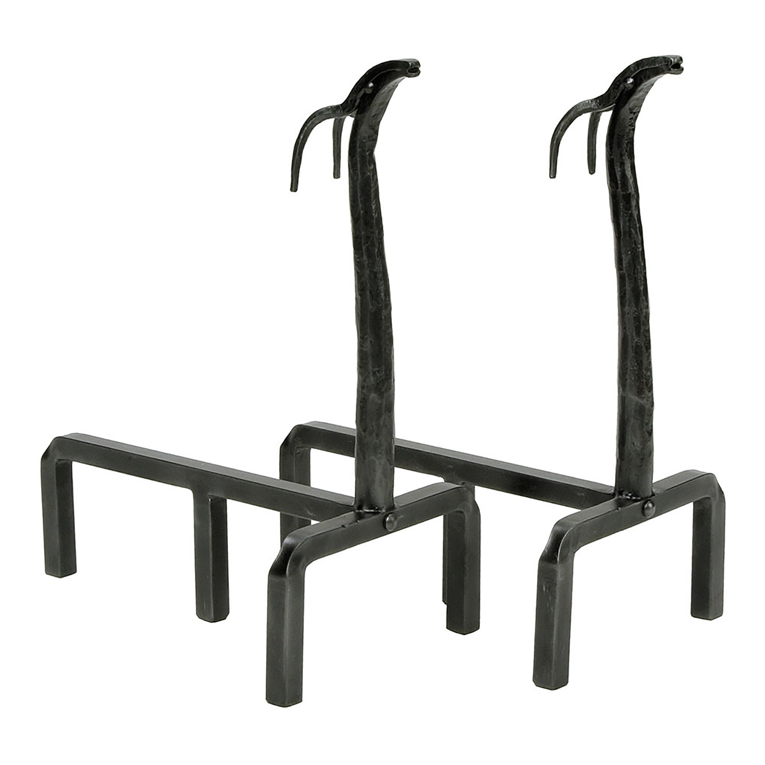 - Hand-forged Wrought Iron: Handcrafted to exclusive design specifications, the Deer Andirons are made in a traditional European ironwork style, from square stock, ending in a stylized deer head. Powder coated in Graphite for the look of natural iron. Each andiron measures 9-inch W by 15-inch D by 18 1/2-inch H.