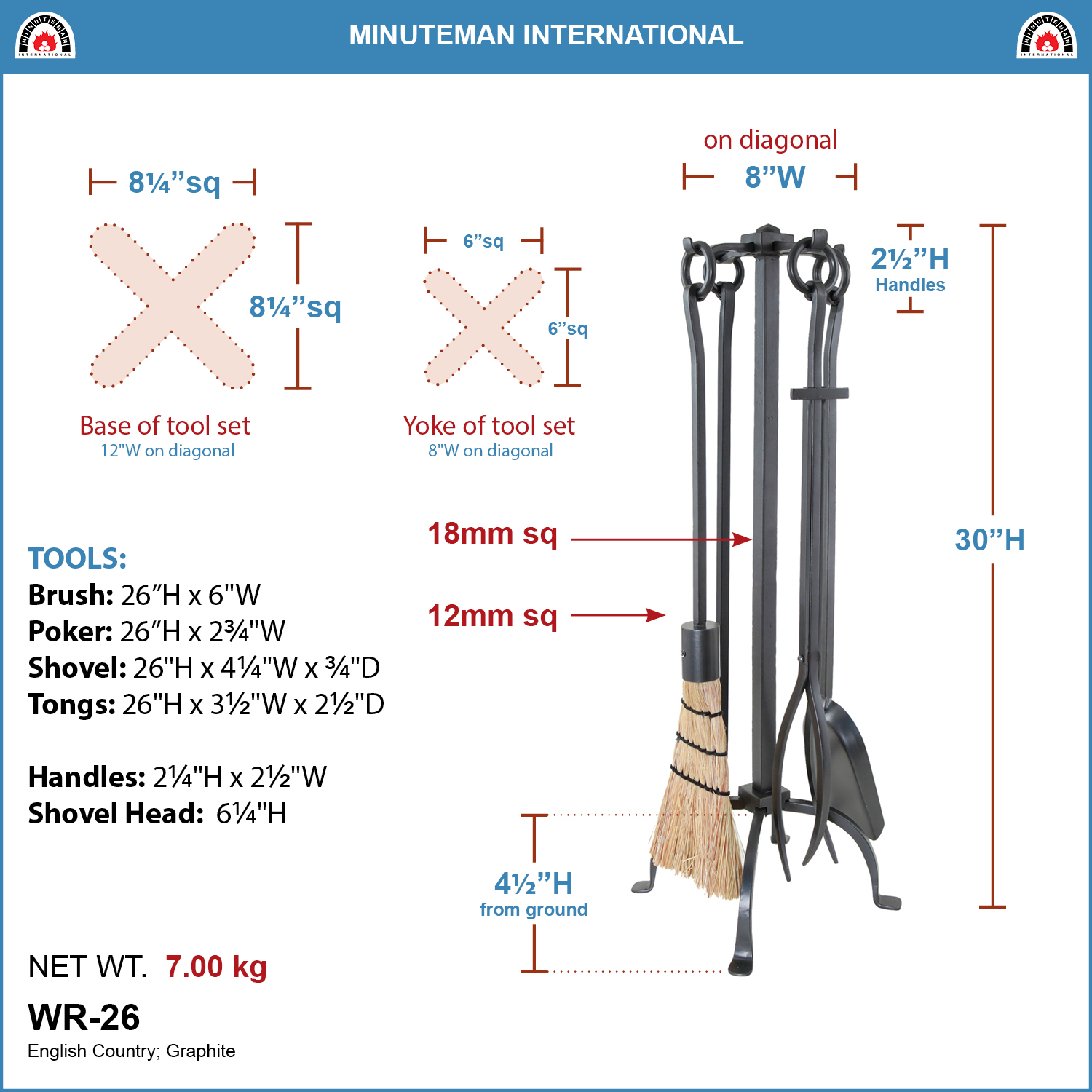 Traditionally made wrought iron tools have stood the test of time because they are both attractive and functional. Minuteman International makes a full line of wrought iron tool sets for all your hearth-tending needs. Our classic wrought iron English Country Tool Set has a traditionally made handle that wraps over the hanging ring. Tools include Poker, Shovel, Tongs, and natural sorghum fiber Brush, all with the looped handle that hangs on the stand. All tools are made from 3/8″ solid square stock and finished in Graphite powder coating for a durable finish that retains the look of natural iron, or a warm Roman Bronze.