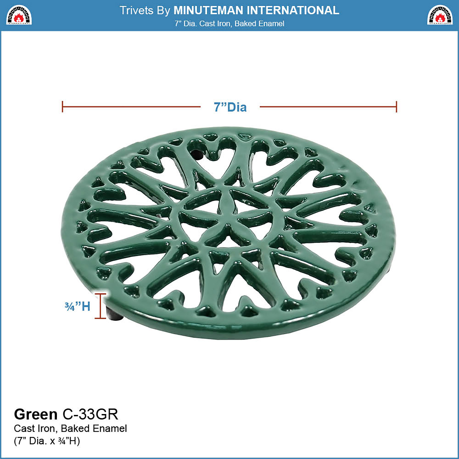 Minuteman International makes a wide array of accessories for wood and pellet stoves. Our colorful line of enameled Sunburst Trivets are handy at the stove top, cook top or table top. Place under kettles, steamers or cooking pots to protect wood stoves from scratches and diffuse heat. Use beneath hot pans or dishes for serving, even under plants to protect the floor.