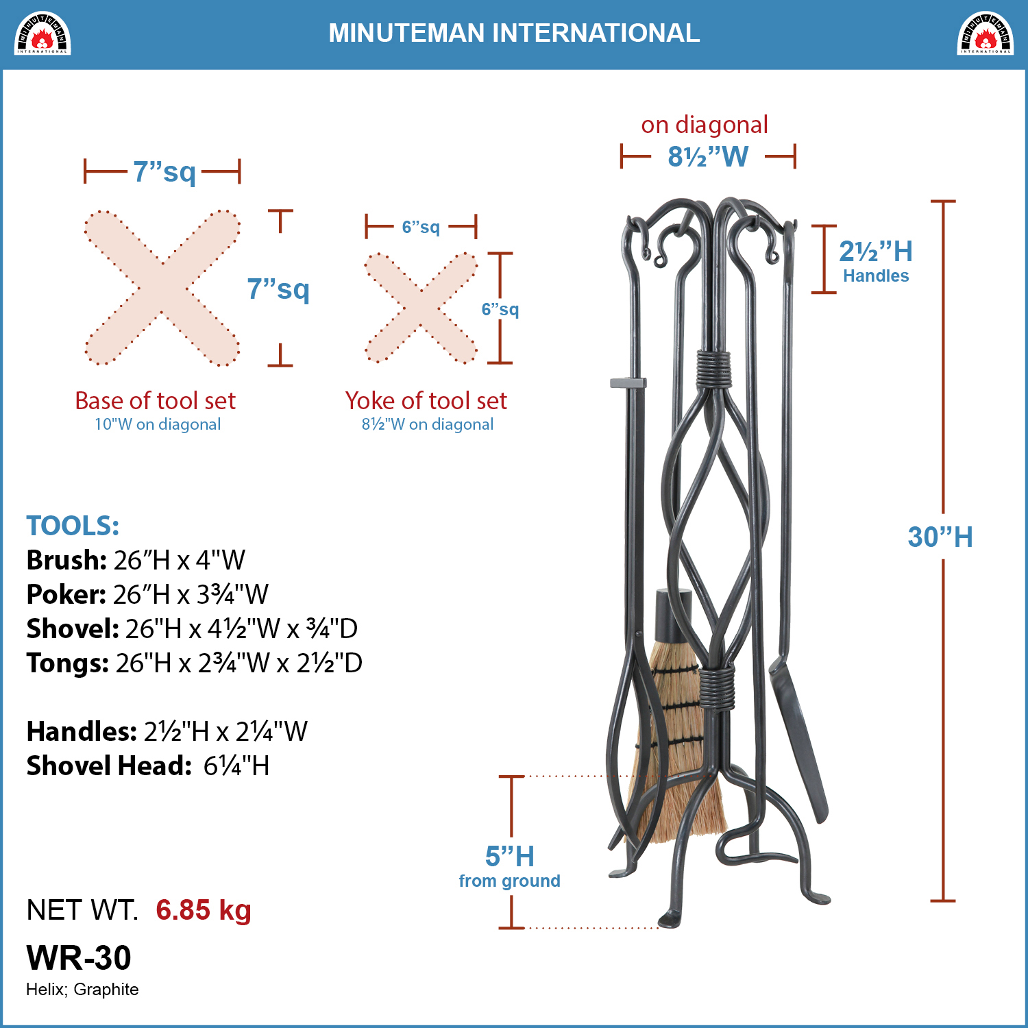 Our beautifully hand-crafted tool sets keep necessary fire-tending tools handy and have a traditional decorative style. The Helix Tool Set employs the traditional multi-strand rope technique to form the stand’s hooks and feet, but the rope is opened, to create an airy twist at the center. Four loop- handled tools are included- poker, tongs, shovel and natural fiber brush. Made of forged wrought iron and finished in a Graphite powder coating for durability with a natural iron look, pair with any of our wrought iron fireplace screens, for a completely handmade hearth.