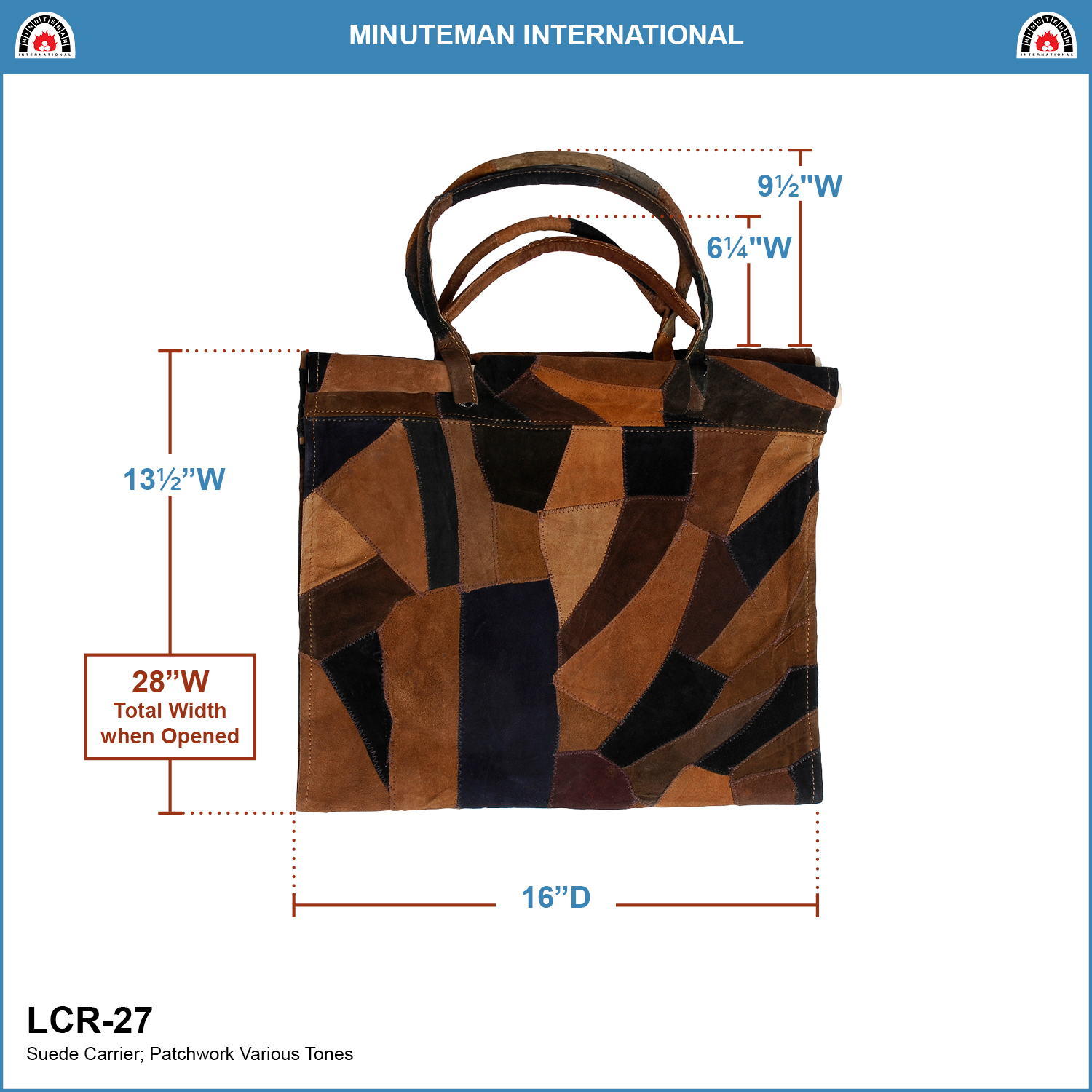 This Suede Log Carrier is a simple and sturdy tote, for easily transporting logs from storage to the hearth. Simply flatten the carrier, load up with firewood and unroll the logs right into your basket or bin. The bag can be rolled up or hung up for next time. Lightweight and durable, made of Dark Brown, Russet and Camel tone patchwork suede leather.