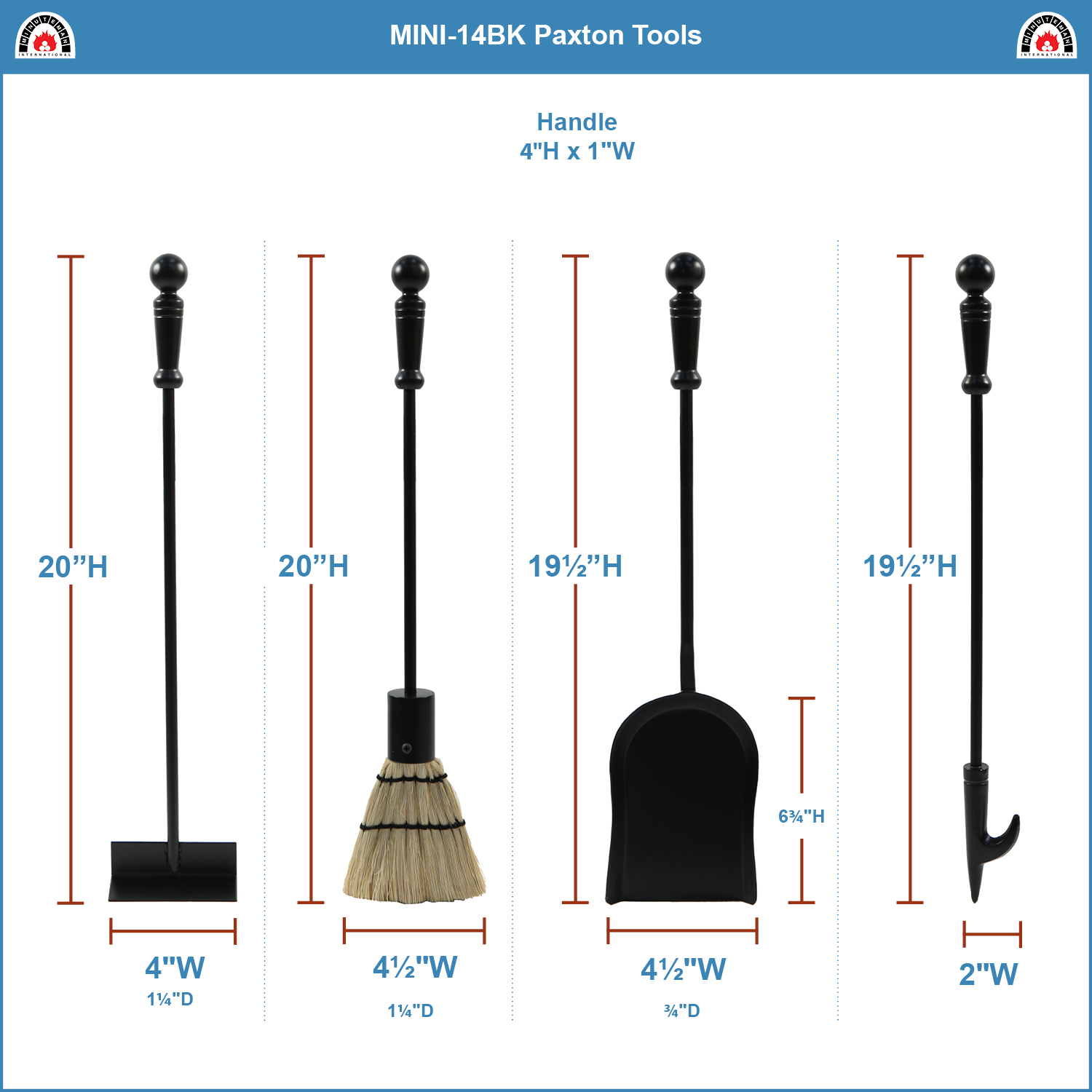 The Paxton Mini Tool Set has a decorative ball-end handles and a plain circular base. Solid die-cast handles and solid rods give these tools good heft and balance. The cast iron base is heavy enough to prevent tipping. The stand features a central handle for moving the set with tools hanging. This set is available in three finish options, all black, or black with polished brass or satin nickel accents. The four compact tools featured- poker, shovel hoe and brush, are ideal for tending a wood or pellet stove.