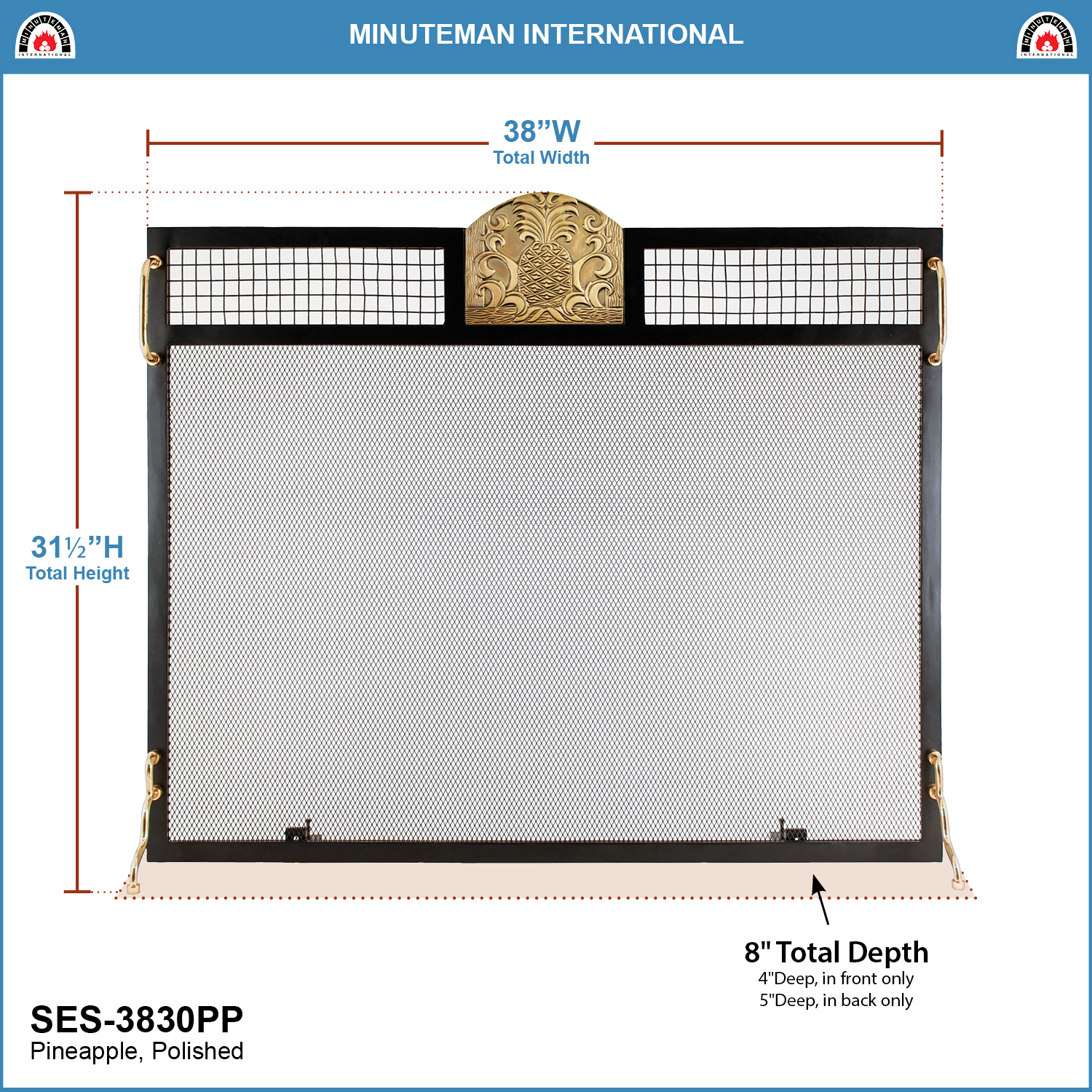 Welcome guests to enjoy a warm hearth with this Pineapple Emblem Flat Fireplace Screen. A beautifully rendered Pineapple, carved in relief and cast in solid brass, is the decorative accent on this flat free-standing screen. Brass handles and feet stand in bold contrast with the matte black wrought iron frame and mesh. Three finely detailed emblem designs, Clematis, Pineapple and Forest Fox, cast in solid brass, are offered in a choice of Polished or Antique finish. Flat fireplace screens fit close to the fireplace surround, providing safety from flying sparks while minimizing bulk. An attractive accent piece for a Mission or Craftsman style decor, these screens are perfect for a shallower hearth. Complement the Emblem screen with our any of our Minuteman International Fireplace Tool Sets in Black and Brass.