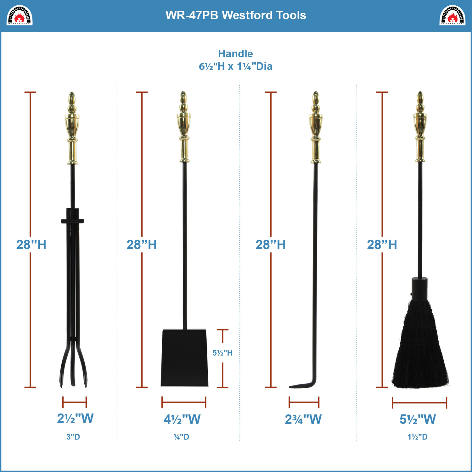 - TWO FINISH OPTIONS- Westford Tool Set is available in Antique or Polished Brass handles with Black to fit your traditional or colonial fireplace style. The handles are electroplated for long-lasting finish with a Black powder coating that is superior to paint.