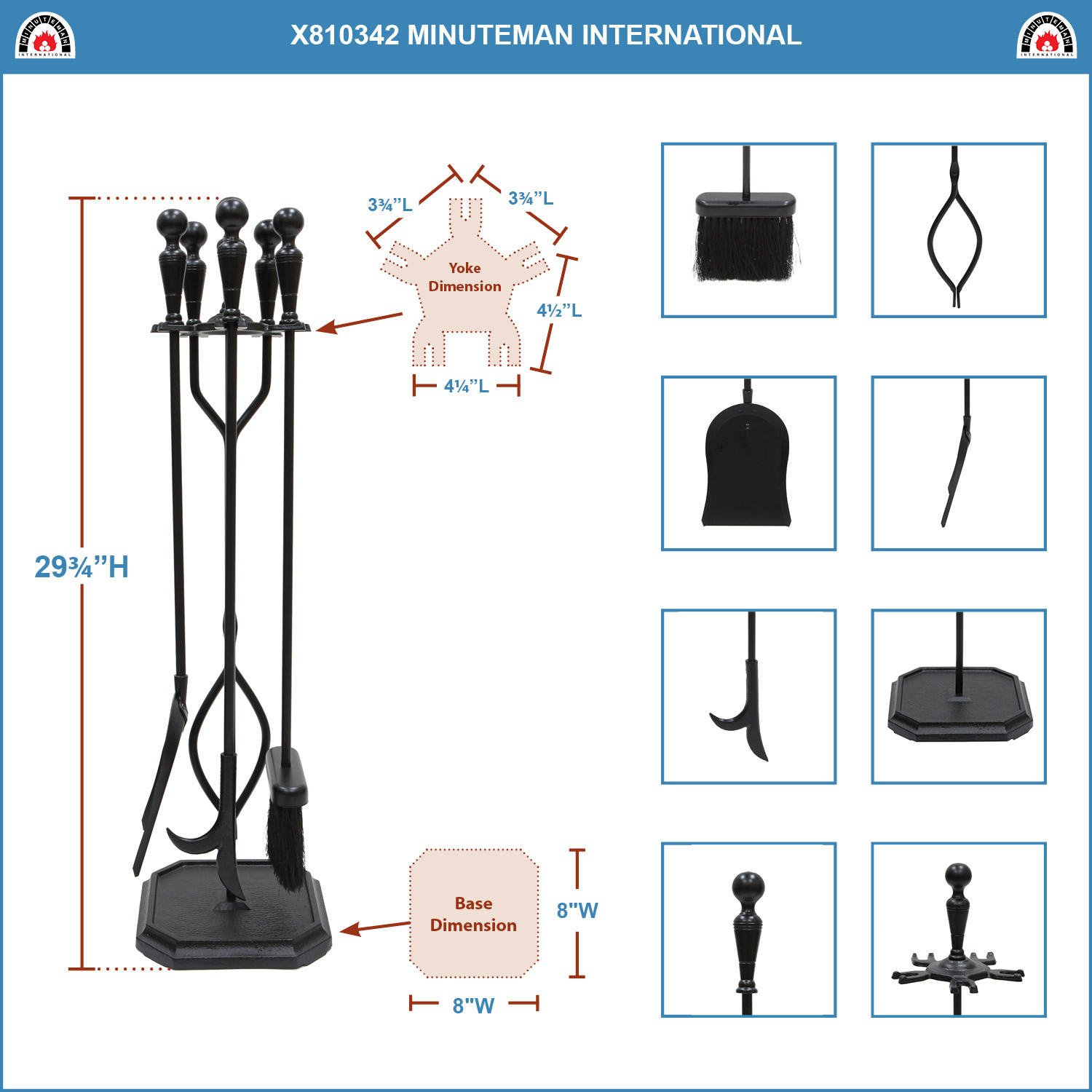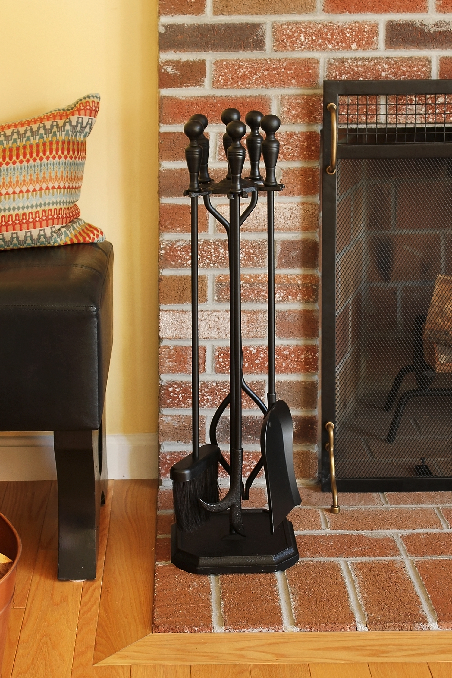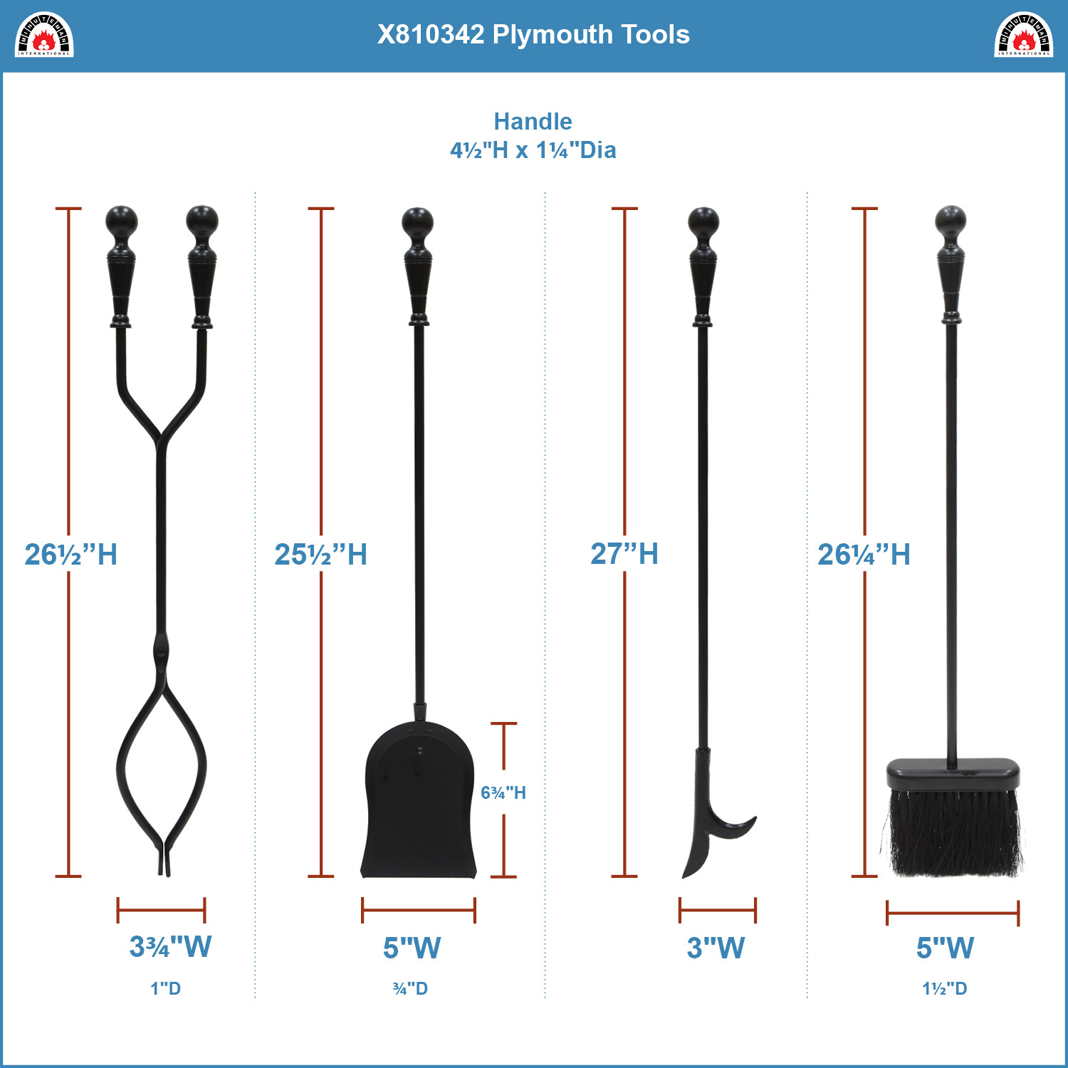 The Plymouth Tool Set has a classic ball-end handle with two stand styles . The Square base features hanging notches for the four tools-poker, tongs, shovel and natural Tampico fiber brush in a radial arrangement with a central handle. The Rectangular Stand Features hanging notches for the brush and tongs, with the poker and shovel resting in the rack. Made with solid cast handles and base, and solid rods for good balance and heft. Add one of our simple black Minuteman International Fireplace Screens for a classic and uncluttered fireplace style.