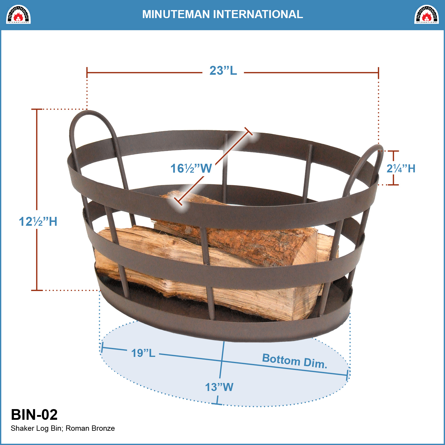 The simple design of these Shaker Log Bins is basket-like, but with the rugged sturdiness of wrought iron. A wonderful way to store your firewood, two comfortable rounded handles allow you to transport logs in a bin attractive enough to blend nicely with other fireplace decor. Made of wrought iron in a choice of natural Graphite or warm Roman Bronze powder coated finishes. These bins complement our Minuteman International wrought iron Fireplace Screens and Tool Sets, to complete your hearth set, be it Mission style, Arts and Crafts or traditional Early American style.