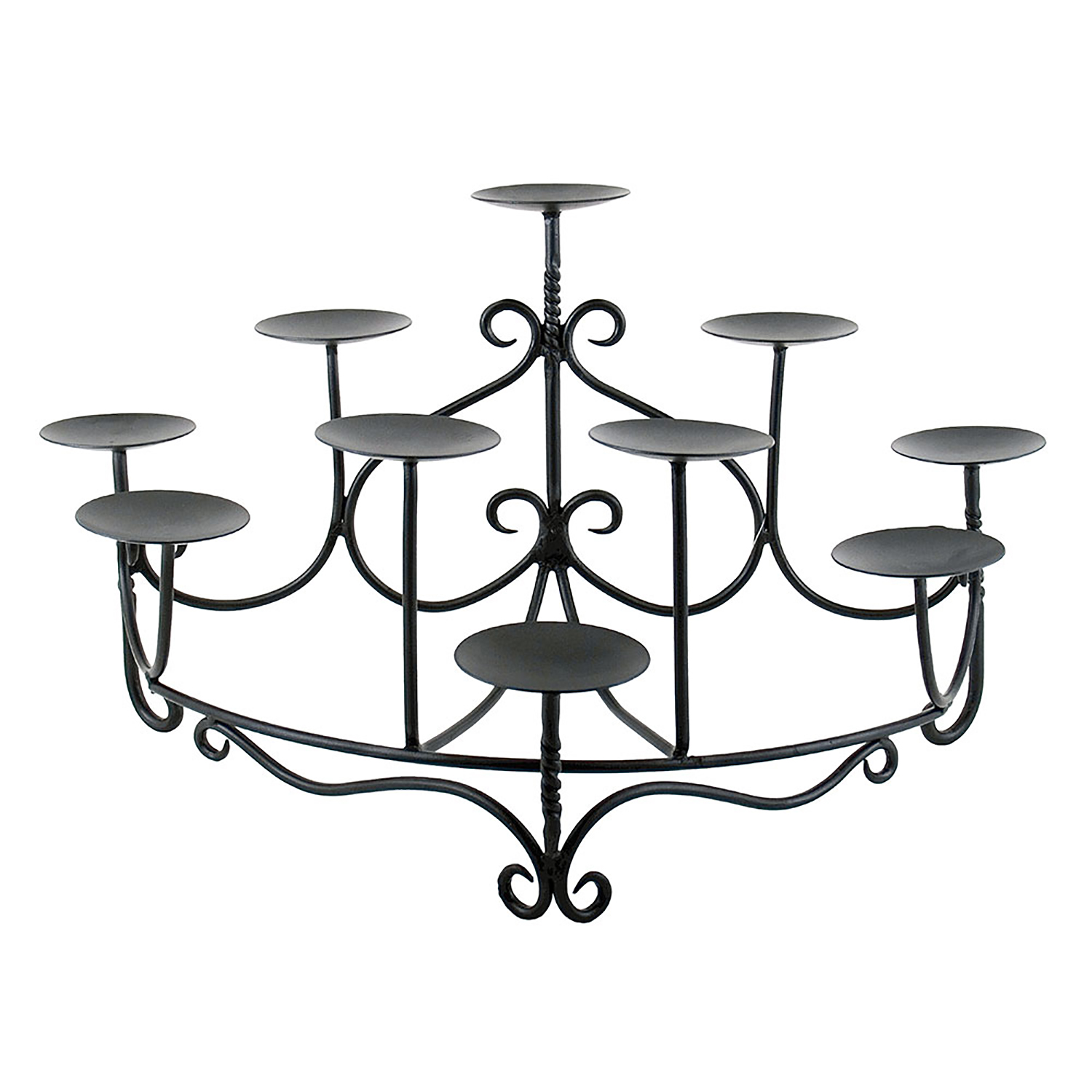 Hearth candelabras provide the warm ambiance of a fire without heat or mess, and are an elegant way to enliven your fireplace when it is not in use, particularly during summer months. Our compact, elegant designs make them equally suitable for tables or sideboards. With a hearth candelabra your fireplace will remain the focal point of your room all year long. Wrought iron spandrels support ten candle platforms 4″ diameter, at varying heights. This piece accepts pillars as well as tapers in traditional wax or LED. The wrought iron is finished with a Graphite powder coating for a durable finish with the look of natural iron.