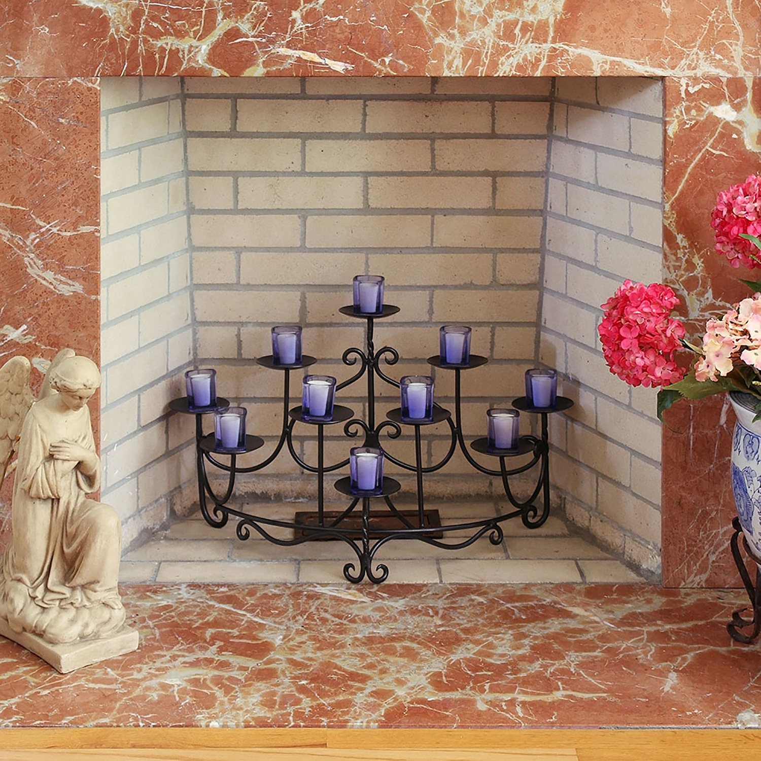 - This elegant wrought iron Spandrels Hearth Candelabra will bring a warm glow to your hearth without the heat or bother of lighting a fire