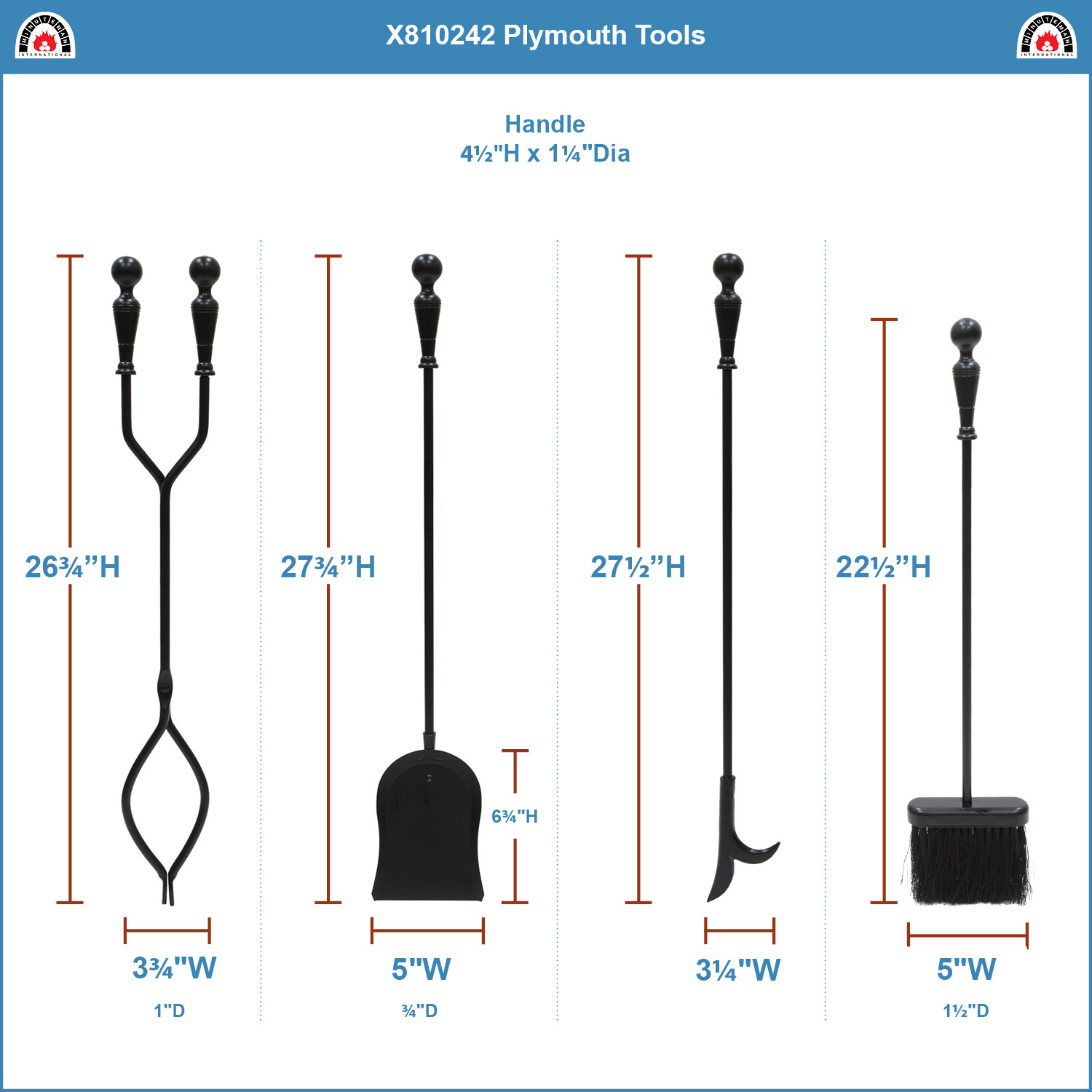 The Plymouth Tool Set has a classic ball-end handle with two stand styles . The Square base features hanging notches for the four tools-poker, tongs, shovel and natural Tampico fiber brush in a radial arrangement with a central handle. The Rectangular Stand Features hanging notches for the brush and tongs, with the poker and shovel resting in the rack. Made with solid cast handles and base, and solid rods for good balance and heft. Add one of our simple black Minuteman International Fireplace Screens for a classic and uncluttered fireplace style.