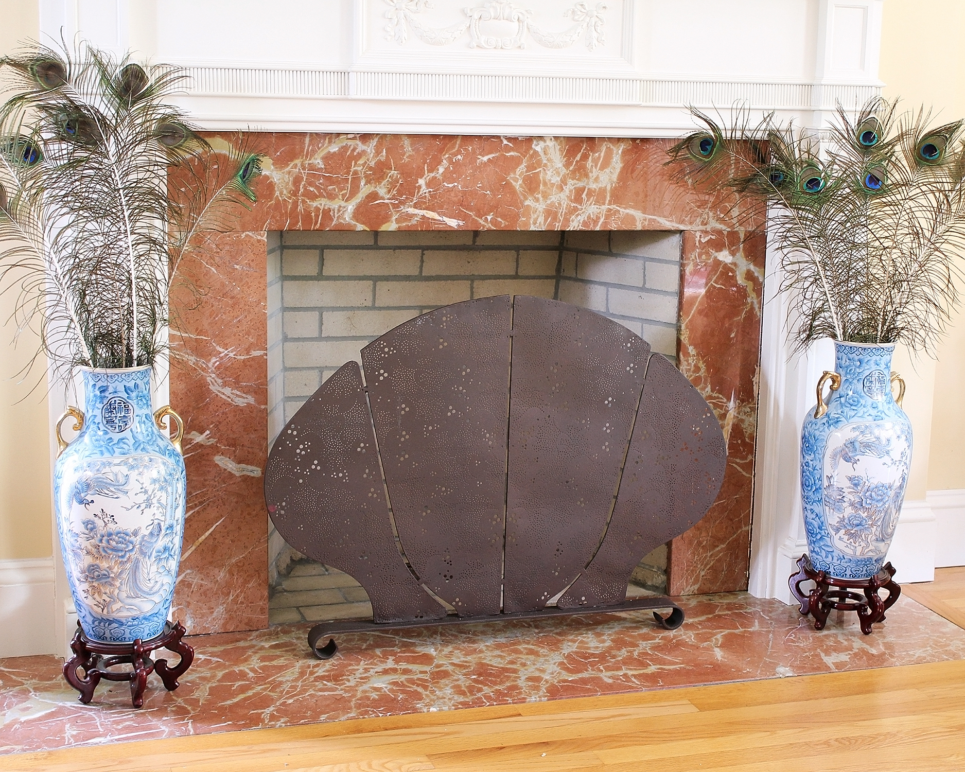 Let the fireplace remain the focal point of the room, even in the summer months with a summer screen. A summer screen adds an element of beauty and interest to your hearth when it is not in use. Many antique pieces feature intricate open patterns in metal. The Stardust Summer Screen is reminiscent of the 18th century love of “Chinoiserie” with its fan shape and delicately perforated pattern. Made of wrought iron with a Roman Bronze finish.