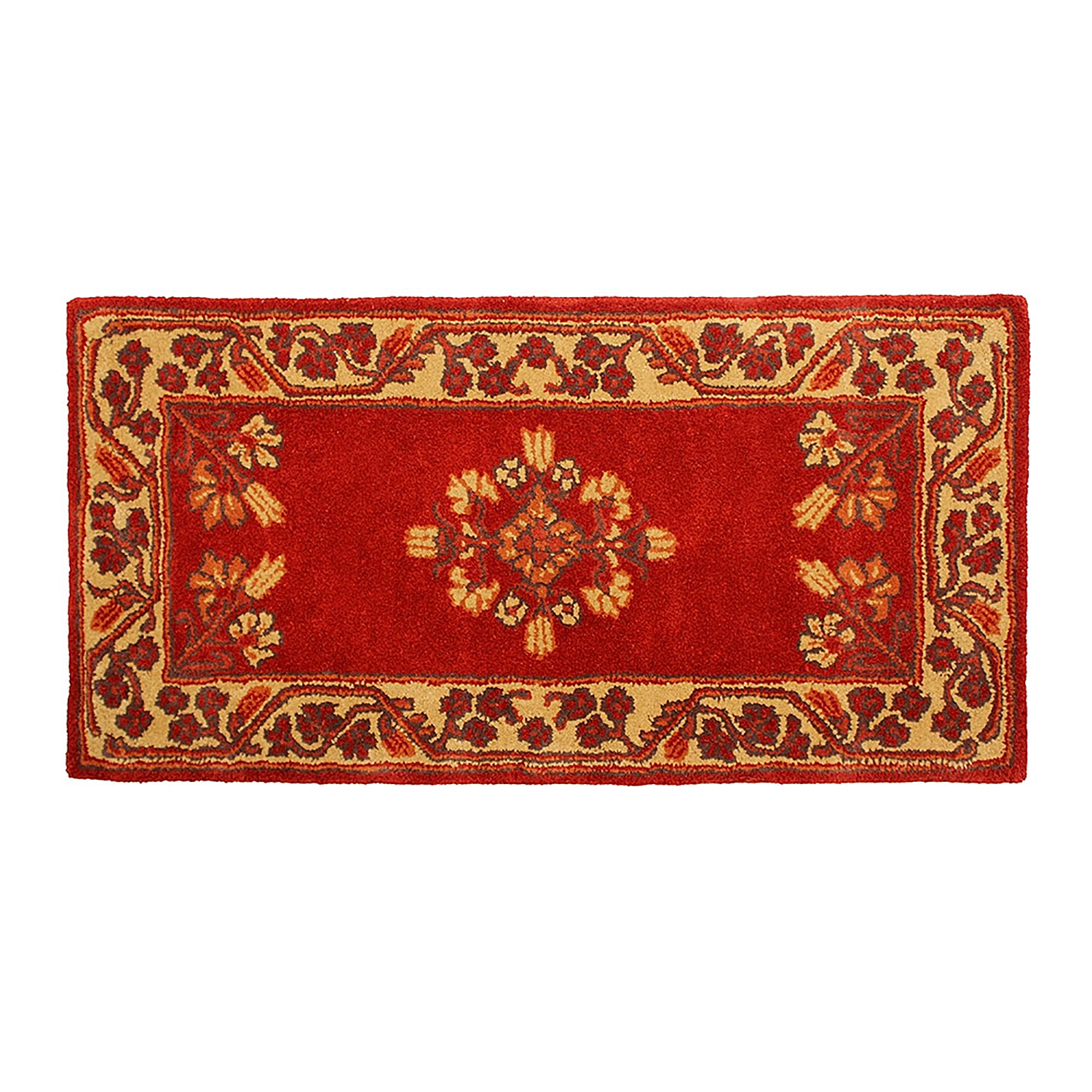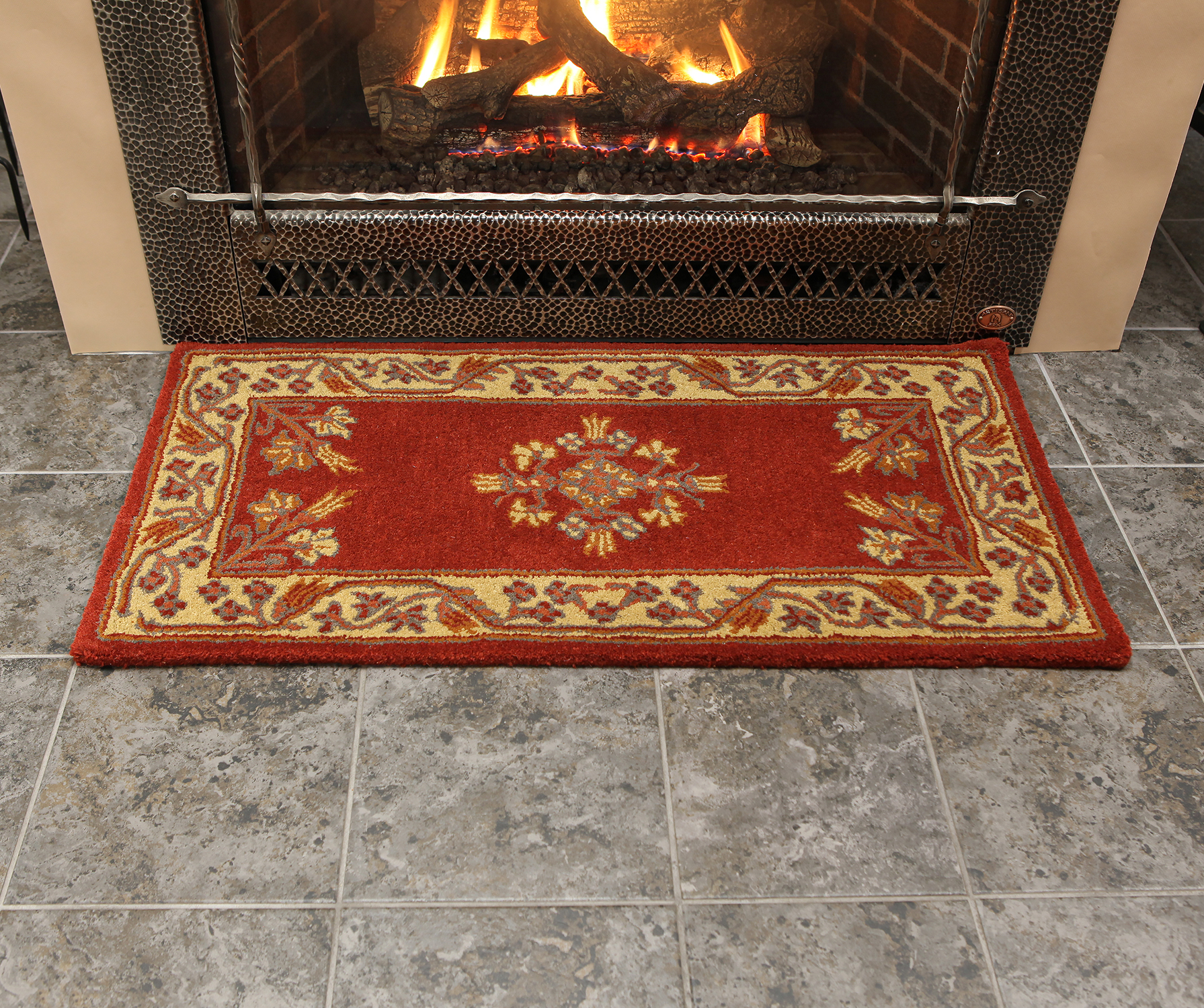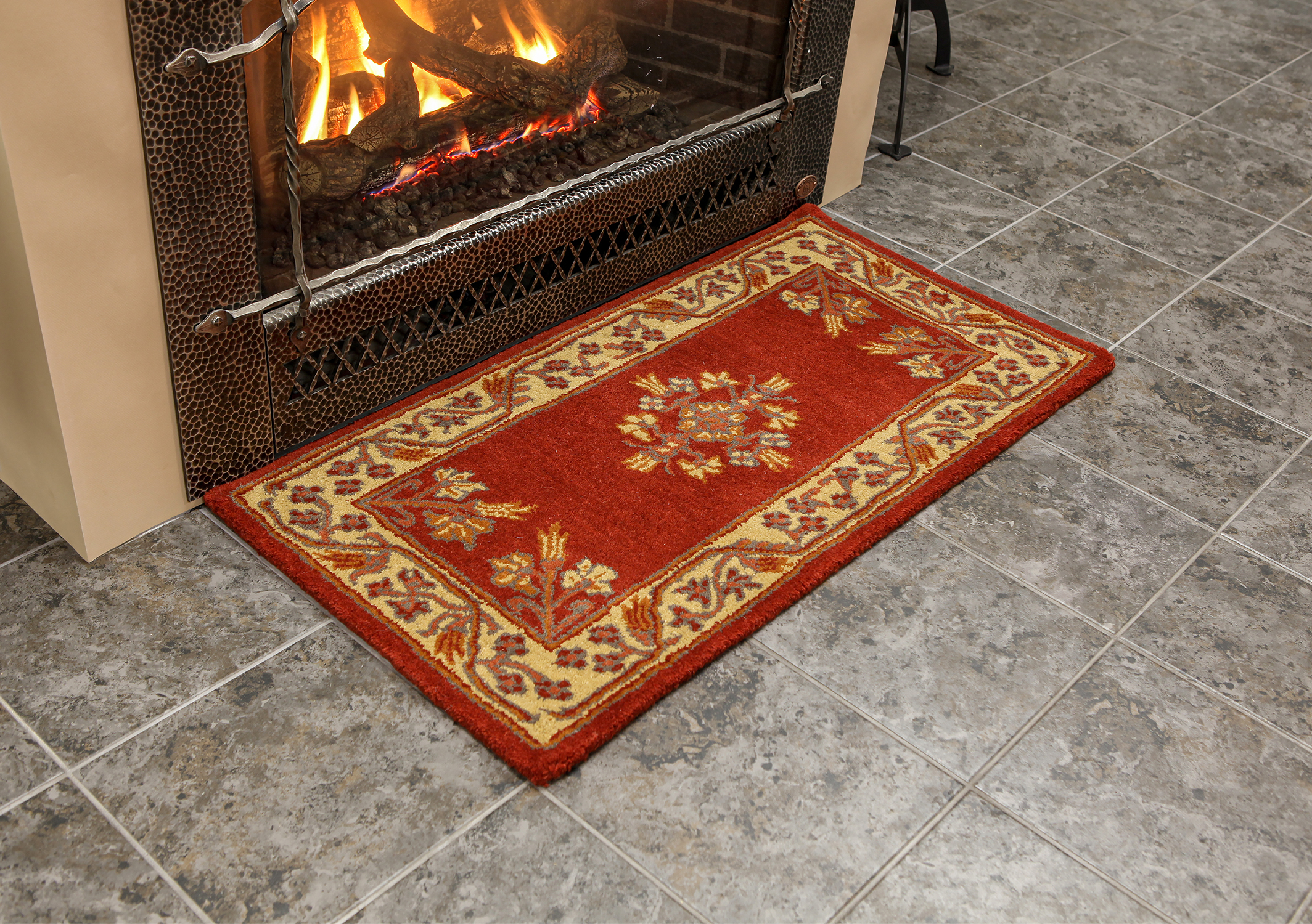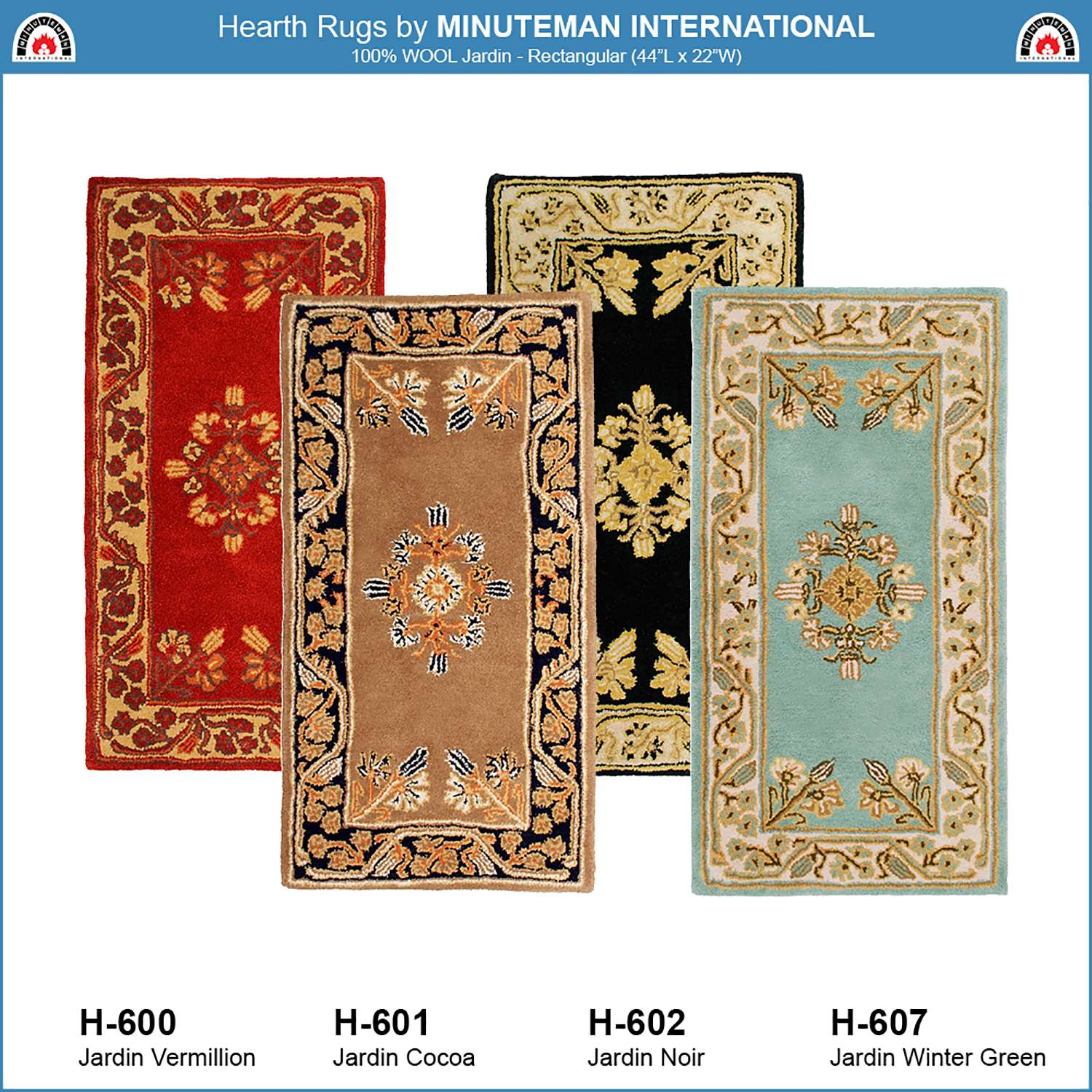 Achla created this Jardin or garden design, inspired by traditional Turkish rugs. Jardin rugs feature medallions of tulips and carnations, and borders of stylized carnations. They are available in rich Vermilion, Cocoa, and Noir, an elegant combination of black and beige. Hearth rugs protect your floor and will add beauty and warmth to your fireplace. They can also be used as door mats or as occasional rugs throughout your house. (For indoor use only).All our hearth rugs are woven from the highest quality 100-Percent virgin wool and dyed in rich saturated colors. They are fire resistant and meet federal requirements for surface flammability of small carpets (Part 1631 – FF2-70). Warning: your pets will probably make a bee-line for these rugs so they can bask in the warmth of the fire!